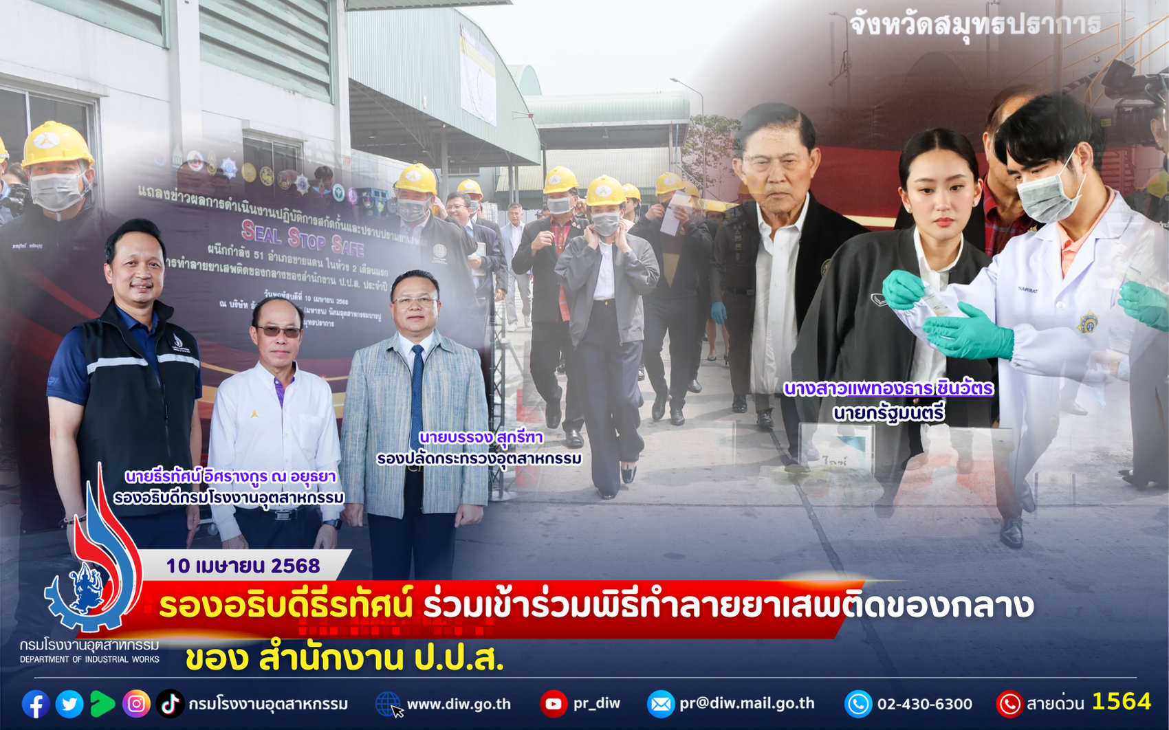 📌เมื่อวันที่ 10 เมษายน 2568 นายพรยศ กลั่นกรอง อธิบดีกรมโรงงานอุตสาหกรรม มอบหมายให้ นายธีรทัศน์ อิศรางกูร ณ อยุธยา รองอธิบดีกรมโรงงานอุตสาหกรรม เข้าร่วมพิธีแถลงผลการดำเนินงานตามปฏิบัติการสกัดกั้นและปราบปรามยาเสพติด Seal Stop Safe ผนึกกำลัง 51 อำเภอชายแดน ในห้วง 2 เดือนแรก (1 กุมภาพันธ์ – 31 มีนาคม 2568) และการทำลายยาเสพติดของกลางของสำนักงานคณะกรรมการป้องกันและปราบปรามยาเสพติด (ป.ป.ส.) ประจำปี 2568 (ครั้งที่ 2) โดยมีนางสาวแพทองธาร ชินวัตร นายกรัฐมนตรี เป็นประธานการ พร้อมด้วย นายภูมิธรรม เวชยชัย รองนายกรัฐมนตรีและรัฐมนตรีว่าการกระทรวงกลาโหม พล.ต.อ.กิตติ์รัฐ พันธุ์เพ็ชร์ ผู้บัญชาการตำรวจแห่งชาติ พล.ต.ท.ภาณุรัตน์ หลักบุญ เลขาธิการ ป.ป.ส. พล.ต.ท.สันติ ชัยนิรามัย ผู้บัญชาการตำรวจปราบปรามยาเสพติด นายศุภมิตร ชิณศรี ผู้ว่าราชการจังหวัดสมุทรปราการ ณ บริษัท อัคคีปราการ จำกัด (มหาชน) นิคมอุตสาหกรรมบางปู จ.สมุทรปราการ ภายในงานมีการเผาทำลายยาเสพติด 27.82 ตัน รวมทั้งการสุ่มตรวจยาเสพติดของกลาง ด้วยวิธี Color’s Test เพื่อตรวจสอบสารเสพติดเบื้องต้นอีกด้วย