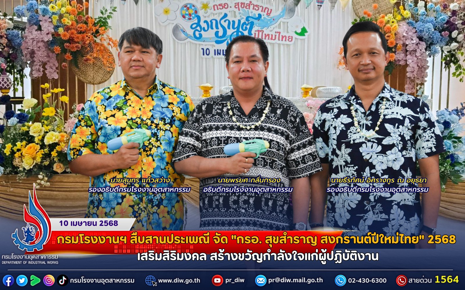 เมื่อวันที่ 10 เมษายน 2568 เวลา 10.30 น. กรมโรงงานอุตสาหกรรม (กรอ.) จัดกิจกรรมเนื่องในเทศกาลสงกรานต์ประจำปี 2568 ภายใต้ชื่องาน “กรอ. สุขสำราญ สงกรานต์ปีใหม่ไทย” โดยมี นายพรยศ กลั่นกรอง อธิบดีกรมโรงงานอุตสาหกรรม เป็นประธานเปิดงาน พร้อมด้วย นายสุนทร แก้วสว่าง นายธีรทัศน์ อิศรางกูร ณ อยุธยา รองอธิบดีกรมโรงงานอุตสาหกรรม ผู้บริหารและเจ้าหน้าที่กรมโรงงานอุตสาหกรรม เข้าร่วมงานอย่างพร้อมเพรียง ณ ห้องประชุม 509 ชั้น 5 อาคารกรมโรงงานอุตสาหกรรม