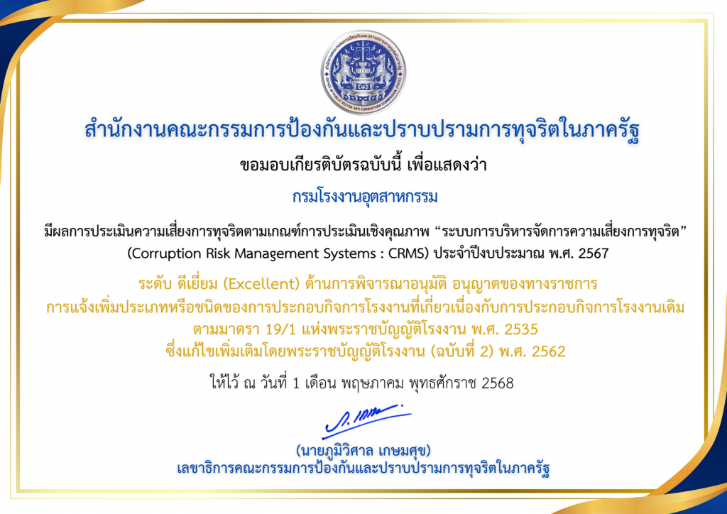 āļ™āļēāļĒāļžāļĢāļĒāļĻ āļāļĨāļąāđˆāļ™āļāļĢāļ­āļ‡ āļ­āļ˜āļīāļšāļ”āļĩāļāļĢāļĄāđ‚āļĢāļ‡āļ‡āļēāļ™āļ­āļļāļ•āļŠāļēāļŦāļāļĢāļĢāļĄ (āļāļĢāļ­.) āļŠāļąāļ‡āļāļąāļ”āļāļĢāļ°āļ—āļĢāļ§āļ‡āļ­āļļāļ•āļŠāļēāļŦāļāļĢāļĢāļĄ āđ€āļ›āļīāļ”āđ€āļœāļĒāļ§āđˆāļē āđ€āļĄāļ·āđˆāļ­āļ§āļąāļ™āļ—āļĩāđˆ 13 āļžāļĪāļĐāļ āļēāļ„āļĄ 2568 āļ—āļĩāđˆāļœāđˆāļēāļ™āļĄāļē āđ„āļ”āđ‰āļĢāļąāļšāļ‚āđˆāļēāļ§āļ”āļĩāļˆāļēāļ āļŠāļģāļ™āļąāļāļ‡āļēāļ™āļ„āļ“āļ°āļāļĢāļĢāļĄāļāļēāļĢāļ›āđ‰āļ­āļ‡āļāļąāļ™āđāļĨāļ°āļ›āļĢāļēāļšāļ›āļĢāļēāļĄāļāļēāļĢāļ—āļļāļˆāļĢāļīāļ•āđƒāļ™āļ āļēāļ„āļĢāļąāļ (āļ›.āļ›.āļ—.) āļ›āļĢāļ°āļāļēāļĻāļœāļĨāļāļēāļĢāļ›āļĢāļ°āđ€āļĄāļīāļ™āļĢāļ°āļšāļšāļšāļĢāļīāļŦāļēāļĢāļˆāļąāļ”āļāļēāļĢāļ„āļ§āļēāļĄāđ€āļŠāļĩāđˆāļĒāļ‡āļāļēāļĢāļ—āļļāļˆāļĢāļīāļ•āļ•āļēāļĄāđ€āļāļ“āļ‘āđŒāđ€āļŠāļīāļ‡āļ„āļļāļ“āļ āļēāļž â€œāļĢāļ°āļšāļšāļšāļĢāļīāļŦāļēāļĢāļˆāļąāļ”āļāļēāļĢāļ„āļ§āļēāļĄāđ€āļŠāļĩāđˆāļĒāļ‡āļāļēāļĢāļ—āļļāļˆāļĢāļīāļ•”(Corruption Risk Management Systems: CRMS) āļ›āļĢāļ°āļˆāļģāļ›āļĩāļ‡āļšāļ›āļĢāļ°āļĄāļēāļ“ 2567 āļ‹āļķāđˆāļ‡ āļāļĢāļĄāđ‚āļĢāļ‡āļ‡āļēāļ™āļŊ āļ—āļģāļ„āļ°āđāļ™āļ™āļŠāļđāļ‡āļ–āļķāļ‡ 95 āļ„āļ°āđāļ™āļ™ āļ‹āļķāđˆāļ‡āļ­āļĒāļđāđˆāđƒāļ™āļĢāļ°āļ”āļąāļš Excellent : E (āļ”āļĩāđ€āļĒāļĩāđˆāļĒāļĄ) āļŠāļģāļŦāļĢāļąāļšāļ āļēāļĢāļāļīāļˆāļāļēāļĢāļ›āļĢāļ°āđ€āļĄāļīāļ™āļ„āļ§āļēāļĄāļŠāļĩāđˆāļĒāļ‡āļāļēāļĢāļ—āļļāļˆāļĢāļīāļ• â€œāļ”āđ‰āļēāļ™āļāļēāļĢāļ­āļ™āļļāļĄāļąāļ•āļī āļ­āļ™āļļāļāļēāļ•āļ‚āļ­āļ‡āļ—āļēāļ‡āļĢāļēāļŠāļāļēāļĢ“ āđƒāļ™āļāļĢāļ°āļšāļ§āļ™āļ‡āļēāļ™ â€œāļāļēāļĢāđāļˆāđ‰āļ‡āđ€āļžāļīāđˆāļĄāļ›āļĢāļ°āđ€āļ āļ—āļŦāļĢāļ·āļ­āļŠāļ™āļīāļ”āļ‚āļ­āļ‡āļāļēāļĢāļ›āļĢāļ°āļāļ­āļšāļāļīāļˆāļāļēāļĢāđ‚āļĢāļ‡āļ‡āļēāļ™ āļ—āļĩāđˆāđ€āļāļĩāđˆāļĒāļ§āđ€āļ™āļ·āđˆāļ­āļ‡āļāļąāļšāļāļēāļĢāļ›āļĢāļ°āļāļ­āļšāļāļīāļˆāļāļēāļĢāđ‚āļĢāļ‡āļ‡āļēāļ™āđ€āļ”āļīāļĄ āļ•āļēāļĄāļĄāļēāļ•āļĢāļē 19/1 āđāļŦāđˆāļ‡āļžāļĢāļ°āļĢāļēāļŠāļšāļąāļāļāļąāļ•āļīāđ‚āļĢāļ‡āļ‡āļēāļ™ āļž.āļĻ. 2535 āļ‹āļķāđˆāļ‡āđāļāđ‰āđ„āļ‚āđ€āļžāļīāđˆāļĄāđ€āļ•āļīāļĄāđ‚āļ”āļĒāļžāļĢāļ°āļĢāļēāļŠāļšāļąāļāļāļąāļ•āļīāđ‚āļĢāļ‡āļ‡āļēāļ™ (āļ‰āļšāļąāļšāļ—āļĩāđˆ 2) āļž.āļĻ. 2562”