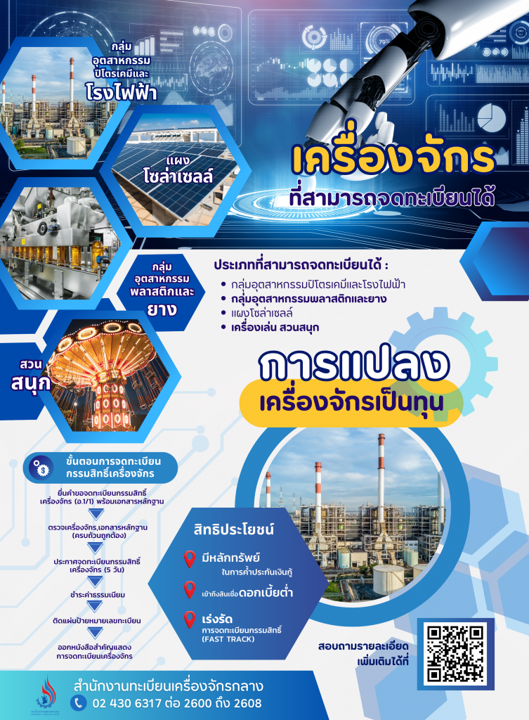 สำนักงานทะเบียนเครื่องจักรกลาง กรมโรงงานอุตสาหกรรม โทร. 02 430 6317 ต่อ 2601-2