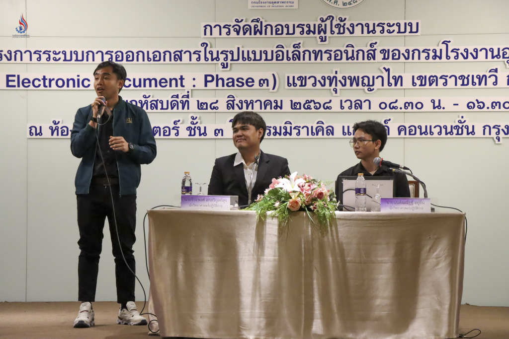 เมื่อวันที่ 28 สิงหาคม 2568 นายปณตสรรค์ สูจยานนท์ รองอธิบดีกรมโรงงานอุตสาหกรรม เป็นประธานเปิดการฝึกอบรมผู้ใช้งานระบบ “โครงการ #ระบบการออกเอกสารในรูปแบบอิเล็กทรอนิกส์ ระยะที่ 3” (DIW Electronic Document : Phase 3) โดยมี นางนันทพร บุญเอก ผู้อำนวยการกลุ่มบริการระบบสารสนเทศกลาง กล่าวรายงานวัตถุประสงค์ในการจัดอบรมฯ มีผู้เข้าร่วมฝึกอบรมทั้งสิ้น จำนวน 210 ท่าน ประกอบด้วย วิทยากร และเจ้าหน้าที่จากกรมโรงงานอุตสาหกรรม ทีมที่ปรึกษาจากมหาวิทยาลัยเกษตรศาสตร์ ผู้ประกอบการ ณ โรงแรมมิราเคิล แกรนด์ คอนเวนชั่น กรุงเทพฯ