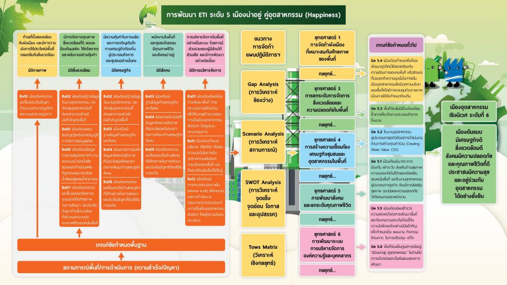 นายปณตสรรค์ รองอธิบดีกรมโรงงานอุตสาหกรรม กล่าวว่า “เกณฑ์ข้อกำหนดเมืองอุตสาหกรรมเชิงนิเวศ ฉบับปรับปรุงปี พ.ศ. 2565 ได้กำหนดระดับการเป็นเมืองอุตสาหกรรมเชิงนิเวศไว้ 5 ระดับ โดยระดับที่ 5 เมืองน่าอยู่ คู่อุตสาหกรรม ได้กำหนดให้พื้นที่ต้องส่งเสริมให้โรงงานอุตสาหกรรม ผู้ประกอบการธุรกิจต้องมีการดำเนินงานด้านการสร้างคุณค่าร่วม (Creating Share Value : CSV) ทั้งในระดับผลิตภัณฑ์ ระดับห่วงโซ่คุณค่า ระดับกลุ่มความร่วมมือ ตามศักยภาพและบริบทของผู้ประกอบกิจการโรงงาน และผู้ประกอบธุรกิจเพื่อพัฒนาและยกระดับคุณภาพชีวิตของคนในพื้นที่ ให้เกิดเมืองหรือพื้นที่อุตสาหกรรมต้นแบบที่มีเศรษฐกิจดี สิ่งแวดล้อมดี สังคม มีความปลอดภัยและคุณภาพชีวิตที่ดี ประชาชนมีความสุขและอยู่ร่วมกับอุตสาหกรรมได้อย่างยั่งยืน”